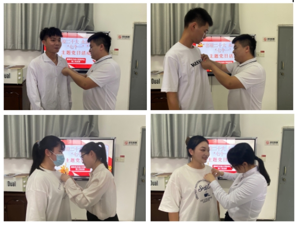 由教师党员为毕业生党员同志佩戴党徽,传递党员的责任和担当精神,鞭策新党员不忘初心、牢记使命,自觉履行党员义务,听党话、感党恩、跟党走。