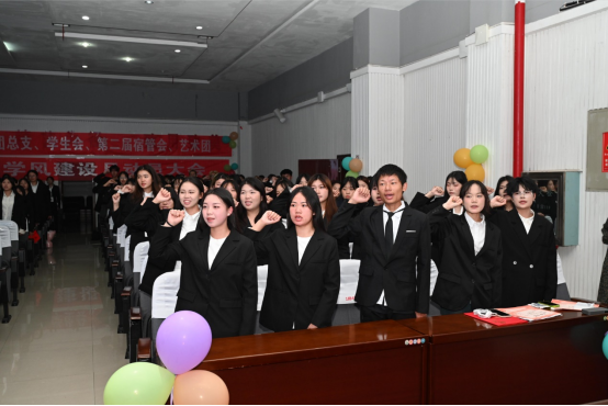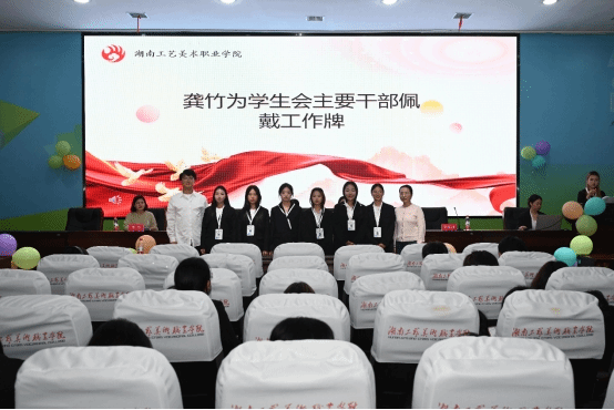 在新一届主要干部佩戴工作牌的仪式后,学生会主席刘淼带领全体成员重温誓词,展示了他们对未来工作的信心与使命感。