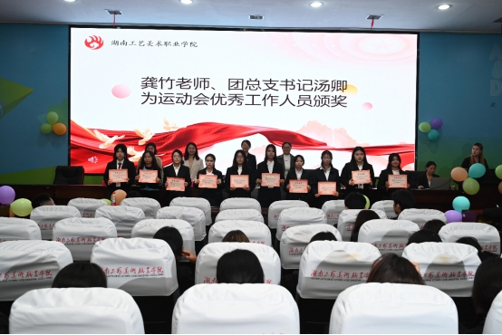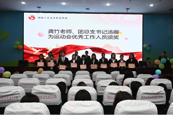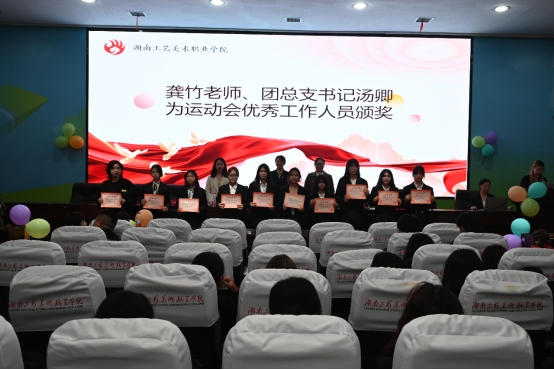龚竹老师、团总支指导老师汤卿为运动会优秀工作人员颁奖