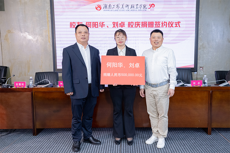 捐赠仪式上,夏能权代表学校与何阳华、刘卓签署了捐赠协议。陈鸿俊为何阳华、刘卓颁发了捐赠证书。