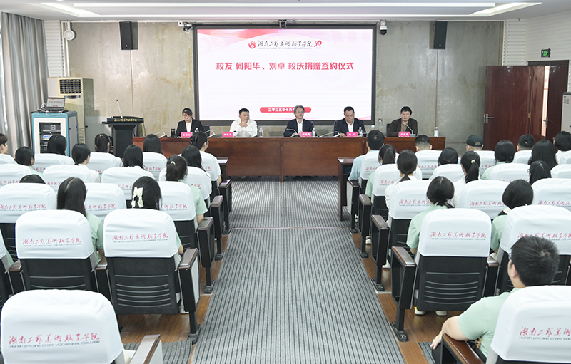 何阳华校友、刘卓校友,学校党委书记陈鸿俊、校长夏能权出席签约仪式,党委副书记汪泳波主持,相关职能部门负责人和首饰专业师生代表参加。
