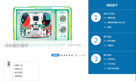《动态图形设计》是数字媒体艺术设计专业核心课程。本课程阐述动态图形的发展历史,讲解动态图形在电影、电视、交互式媒体、公共空间中的应用,以及动态图形设计与制作的方法、规则和流程。通过教学使学生掌握动态图形基础知识,掌握动态图形的设计规律和制作技术,并能结合市场创作出符合主题并具一定视觉冲击力的动态图形作品。课程链接:https://mooc1-1.chaoxing.com/course/211018282.html